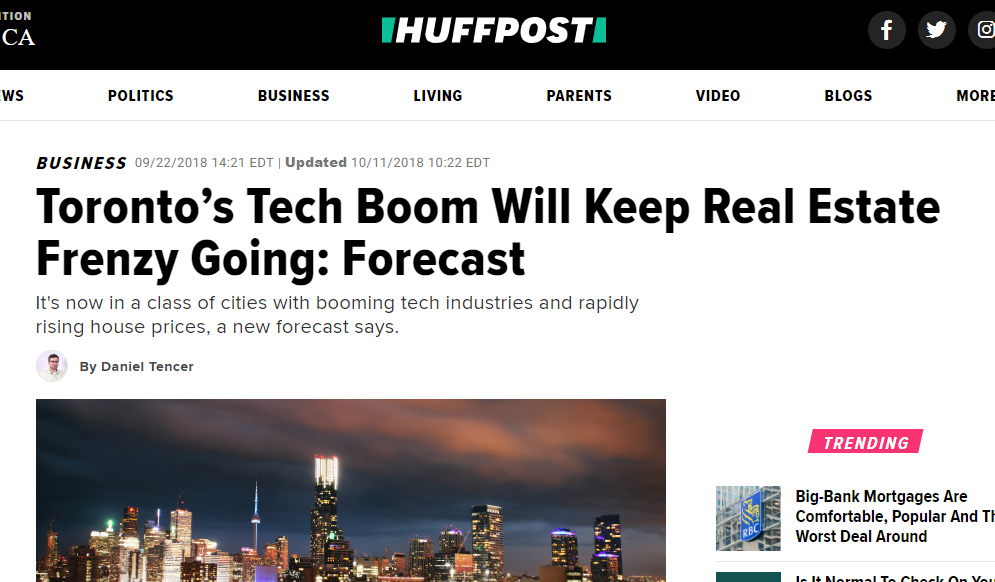Toronto, Ontario — a September 2018 article “Toronto’s Tech Boom Will Keep Real Estate Frenzy Going: Forecast“