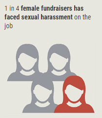 In April 2018, the Chronicle of Philanthropy and the Association of Fundraising Professionals released results of a survey…. “About one in four female fundraisers has experienced sexual harassment in their careers, according to the poll, while only 7 percent of male fundraisers have. Almost all the harassers — 96 percent — are men…. 65 percent have been harassed by a donor and 35 percent by a board member” (source: Fundraisers Poll)
