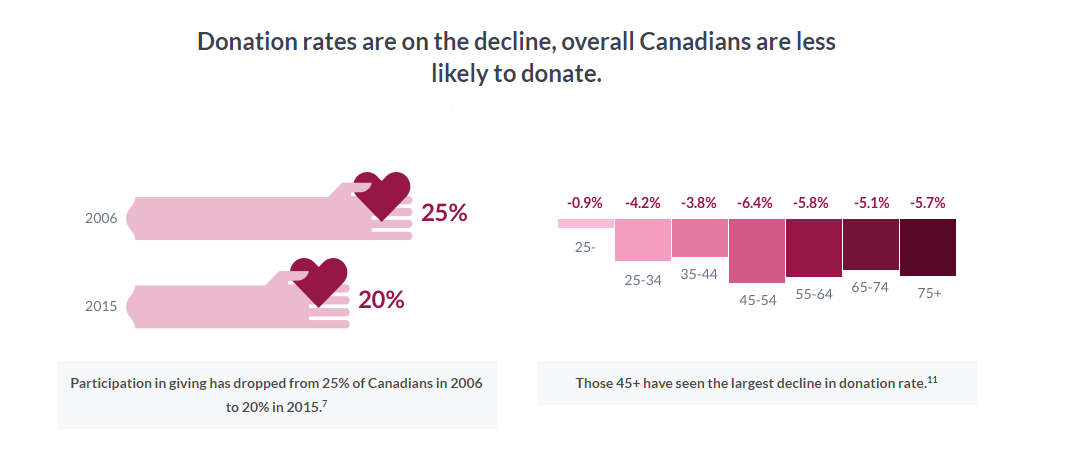 In its 2018 The Giving Report, Canada Helps also noted a decrease in giving by Canadians, with the most significant decrease in donation by those 45+ (Canada Helps Giving Facts).