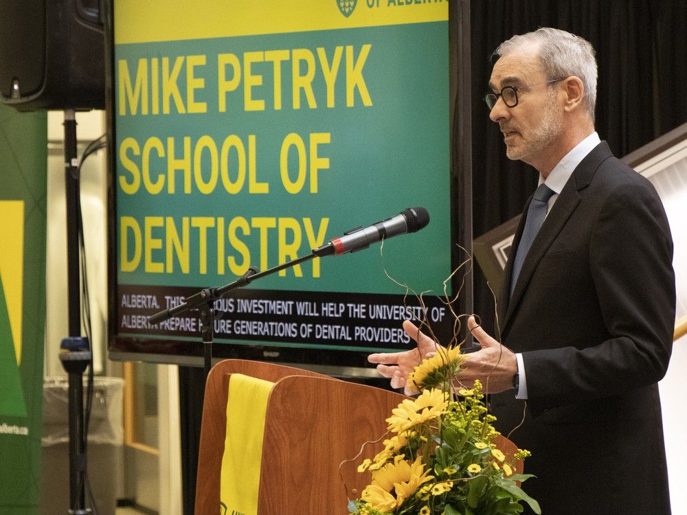 Bill Flanagan, president of the University of Alberta, unveils the newly-named Mike Petryk School of Dentistry on Tuesday, Sept. 10, 2024. Photo by Shaughn Butts /Postmedia